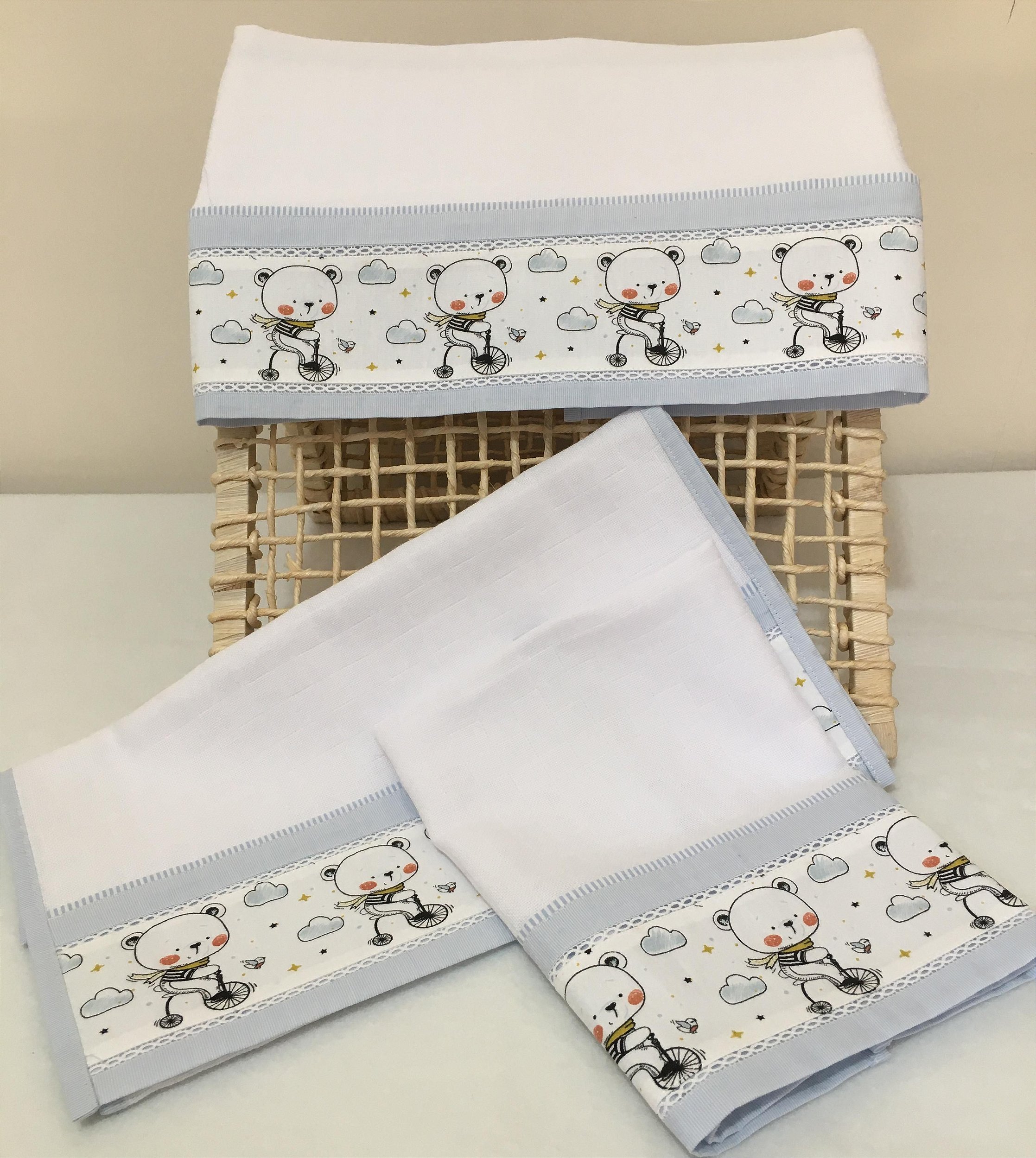 O kit é produzido com tecido 100% algodão e fralda macia e delicada, o acabamento é feito em viés na cor do composê usado na barra.